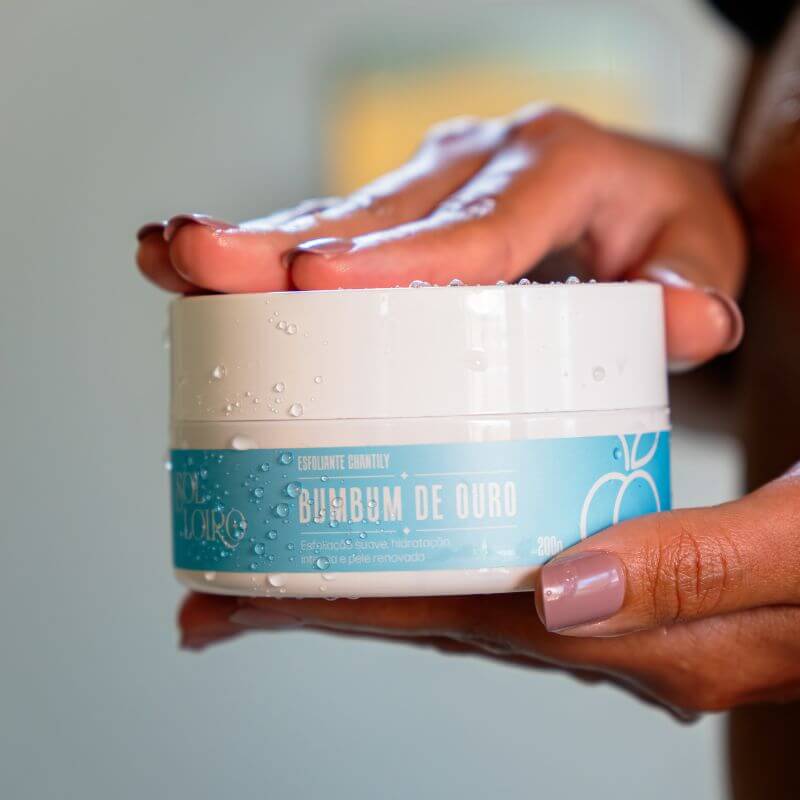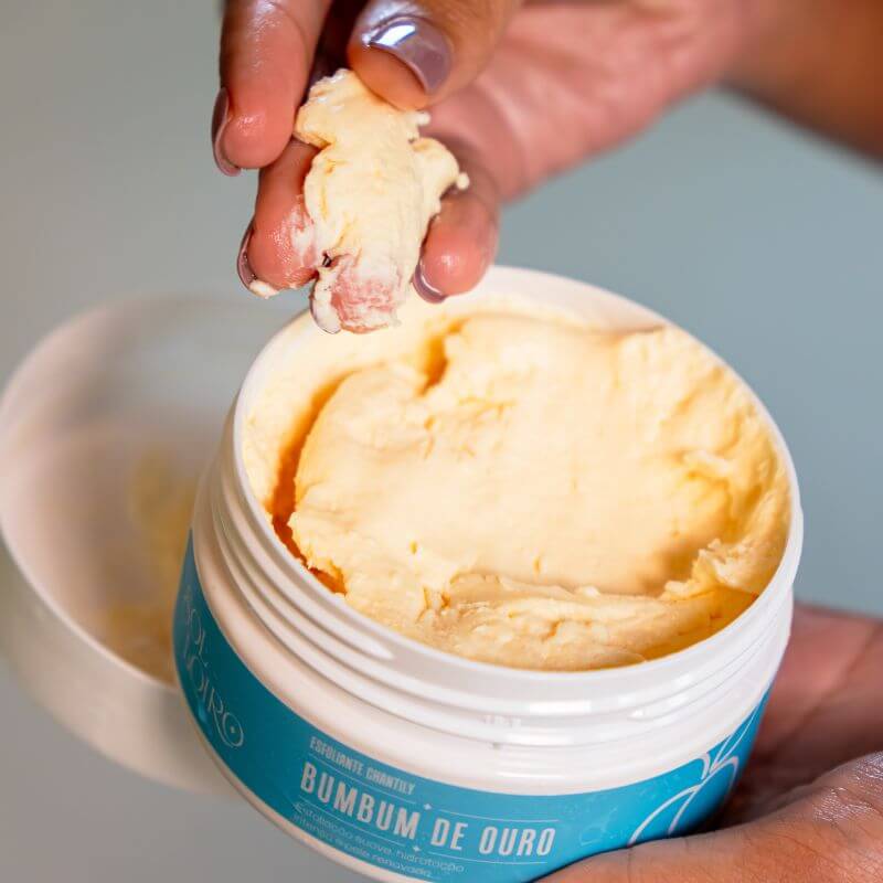 Aplique o Esfoliante Chantilly Bumbum de Ouro sobre a pele úmida no banho.